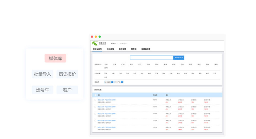 KOL一鍵點(diǎn)擊自動(dòng)入選號(hào)車(chē),網(wǎng)絡(luò)購(gòu)物體驗(yàn)操作簡(jiǎn)單;支持多種常用媒體類(lèi)別,并可以自主擴(kuò)展配置。支持EXCEL批量導(dǎo)入渠道供應(yīng)商的媒體報(bào)價(jià),自動(dòng)識(shí)別新媒體并入庫(kù),保留報(bào)價(jià)歷史版本。