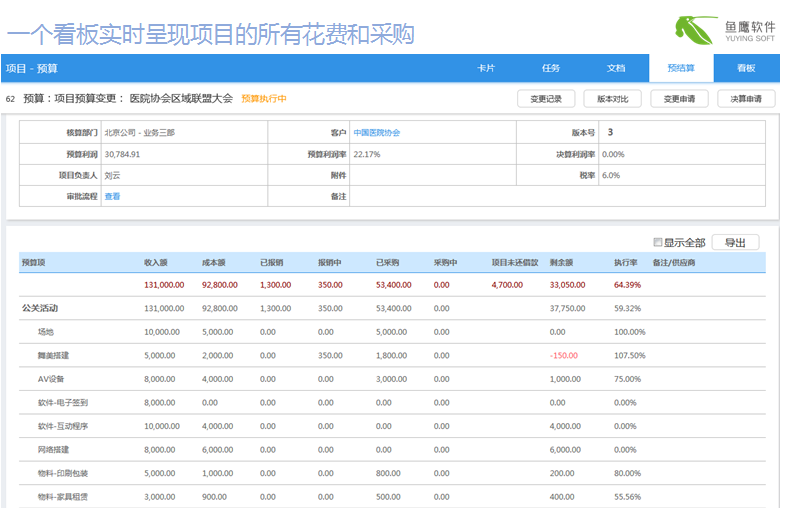 針對(duì)公關(guān)行業(yè)項(xiàng)目多、周期長(zhǎng),成本核算及成本控制難等行業(yè)痛點(diǎn),魚(yú)鷹軟件著力在“控成本、管創(chuàng)意、抓效率”三個(gè)方面,結(jié)合客戶管理、報(bào)價(jià)管理、合同管理、采購(gòu)與供應(yīng)商管理、項(xiàng)目管理、費(fèi)用管控、運(yùn)營(yíng)報(bào)表、協(xié)同OA等管理模塊給出運(yùn)營(yíng)管理一體化解決方案,全面幫助廣告公關(guān)行業(yè)客戶用信息化手段提升企業(yè)內(nèi)部管控能力。 并始終致力于為公關(guān)會(huì)展企業(yè)打造集系統(tǒng)功能性、管控實(shí)用性及行業(yè)先進(jìn)性于一體的信息化建設(shè)解決方案。