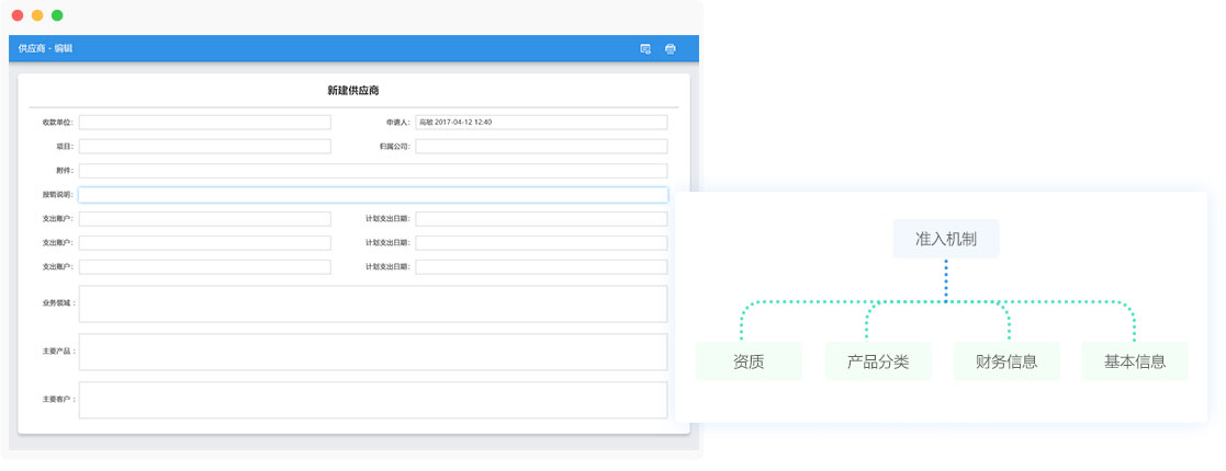 依照企業(yè)供應(yīng)商甄選規(guī)則篩選出符合相關(guān)標(biāo)準(zhǔn)的供應(yīng)商,并新建供應(yīng)商入庫(kù),供應(yīng)商基本信息、相關(guān)資質(zhì)、財(cái)務(wù)信息、產(chǎn)品信息等錄入