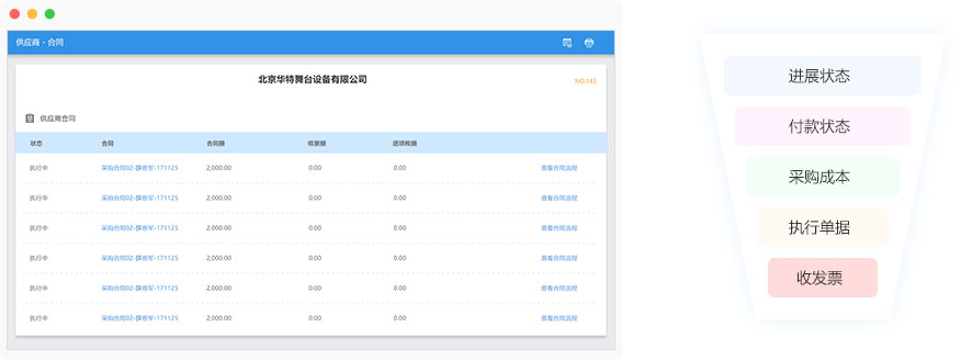 從單個(gè)的供應(yīng)商或者項(xiàng)目可以查看實(shí)時(shí)的付款狀態(tài),實(shí)時(shí)的統(tǒng)計(jì)采購(gòu)過(guò)程中每個(gè)環(huán)節(jié)的進(jìn)展?fàn)顟B(tài),實(shí)時(shí)的反饋每個(gè)采購(gòu)訂單的執(zhí)行狀態(tài)單據(jù),自動(dòng)歸集采購(gòu)成本和開(kāi)發(fā)票數(shù)量