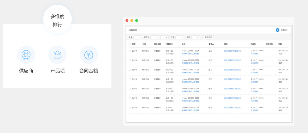 供應(yīng)商、產(chǎn)品項(xiàng)、合同金額等不同維度進(jìn)行采購(gòu)排行,為企業(yè)采購(gòu)及供應(yīng)商管理提供數(shù)據(jù)支撐