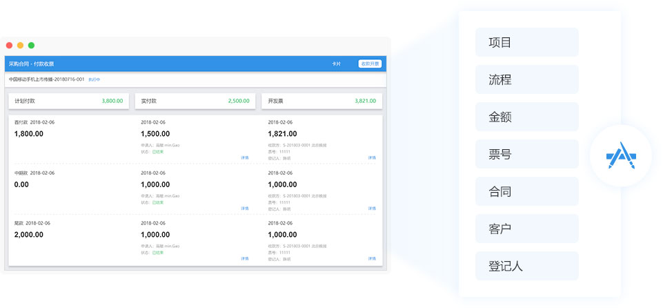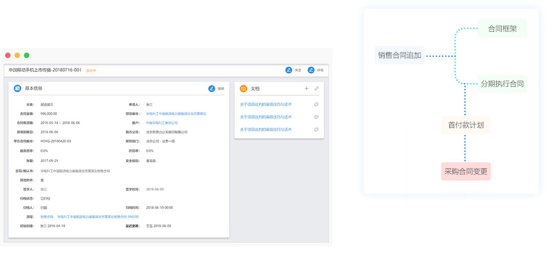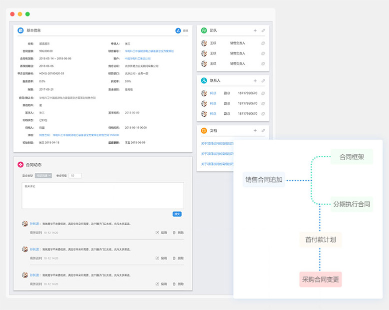 執(zhí)行銷售框架合同、分期執(zhí)行合同;一個銷售合同可以追加多個銷售訂單,每個銷售訂單都可以創(chuàng)建其收款計劃;銷售合同和其所有的追加訂單形成完整的合同;支持銷售合同和銷售訂單的變更申請。