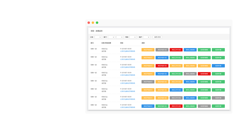項(xiàng)目整體進(jìn)度看板,以里程碑任務(wù)展示進(jìn)度狀態(tài),通過直觀的顏色、計(jì)劃與實(shí)際完成時(shí)間、